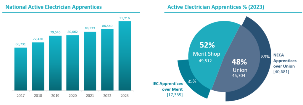 • IEC had 17,335 active apprentices in 2023, representing a 35% market share within merit shop and 18% of the overall market