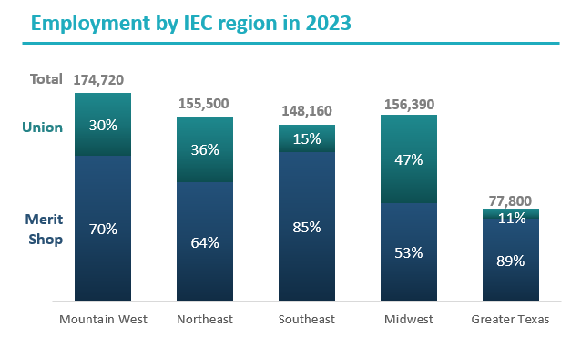 • IEC contractor members employ an estimated 87,740 electrical workers, representing around 17% of merit shop electrician employment (501,998 in 2023)​